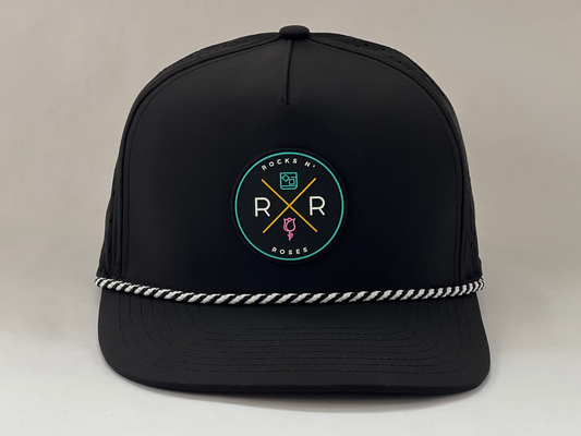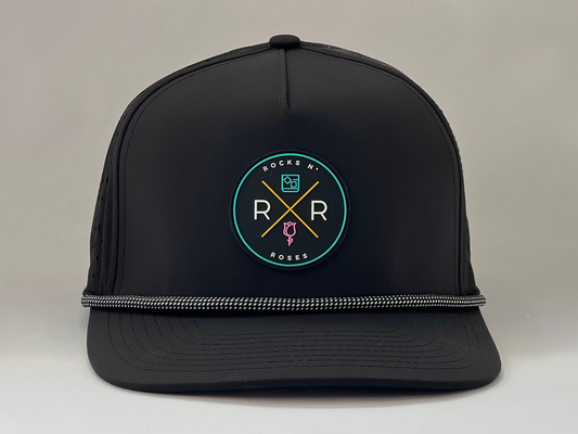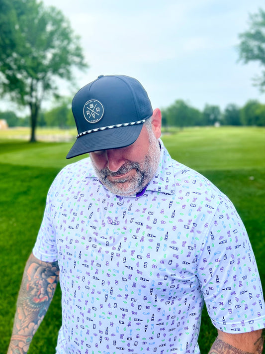 Black Golf Snapback Hat with Rubber Logo and Rope